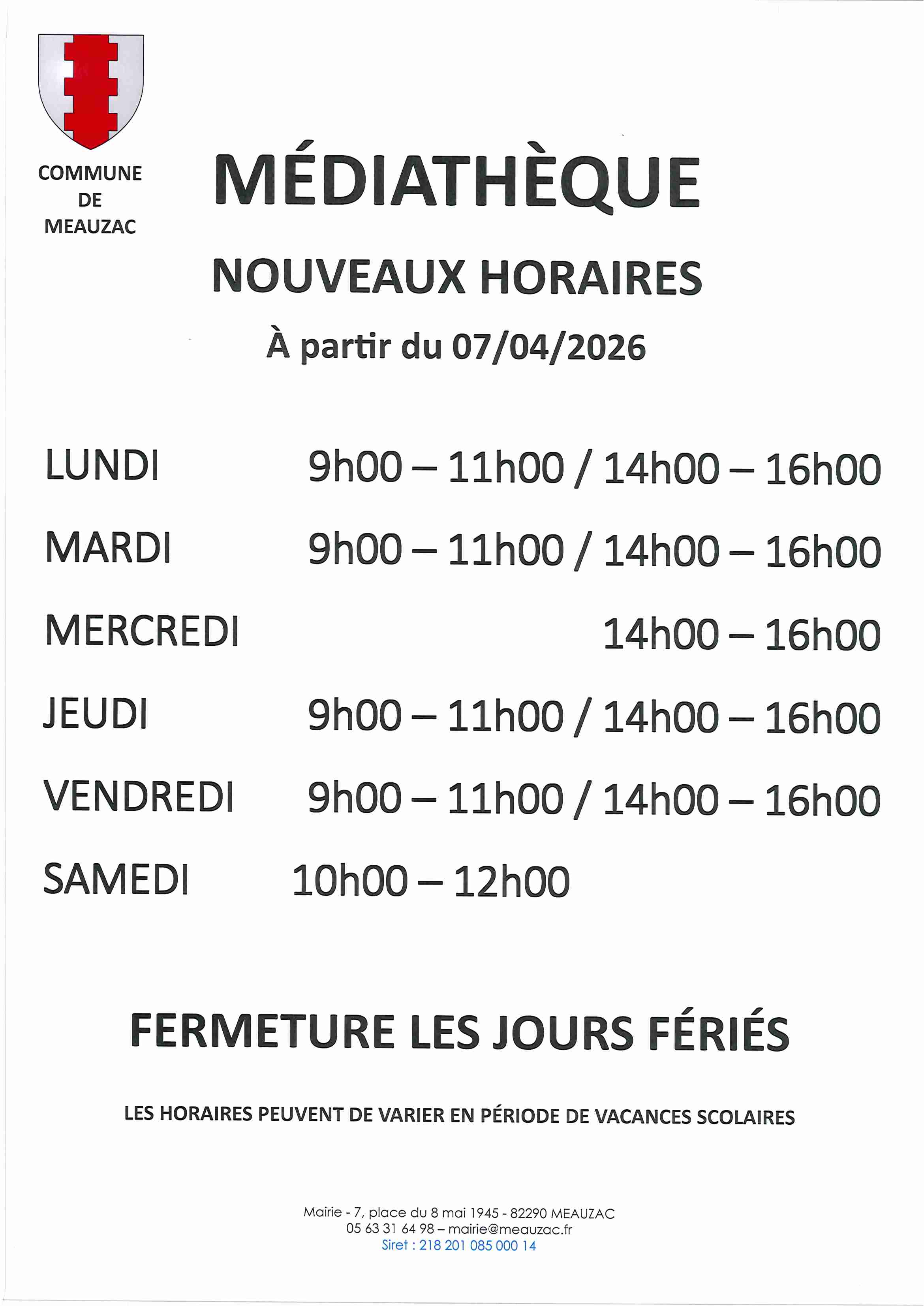 À partir du 07 avril 2026 les horaires de la médiathèque changent.