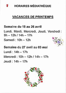 VACANCES DE PRINTEMPS : HORAIRES MÉDIATHÈQUE