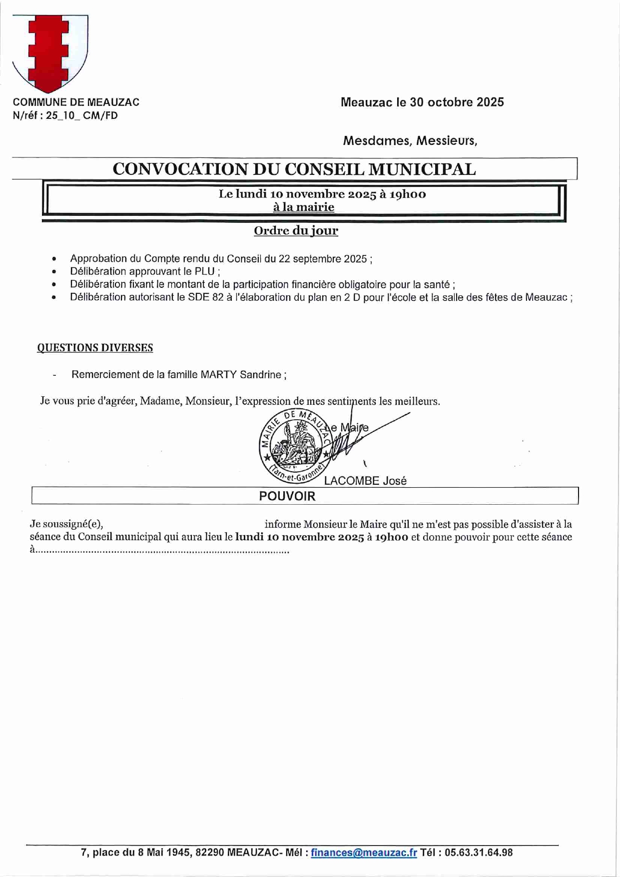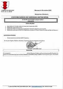 Convocation du conseil municipal du lundi 10 novembre 2025 à 19h.